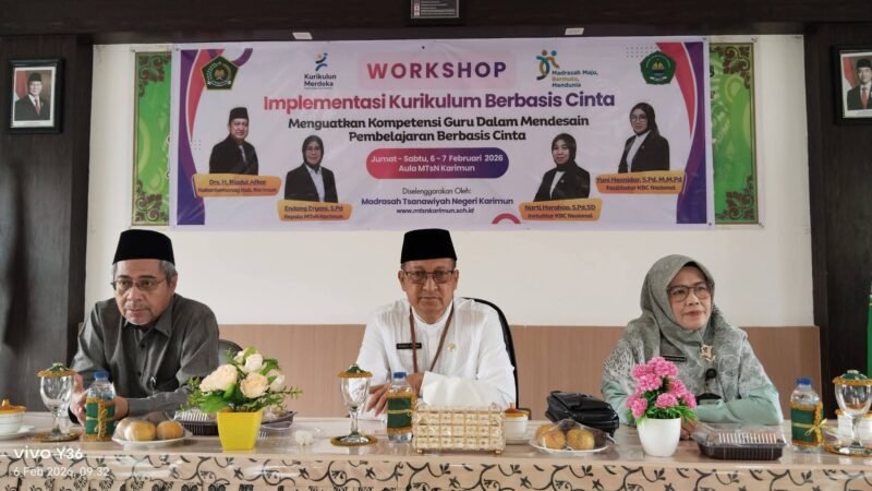 Karimun-Kepala Kemenag Kabupaten Karimun Drs.H Riadul Afkar, didampingi oleh Kasi. Pendidikan Islam Kemenag Kabupaten Karimun, Endang Sriwahyu,S.Ag.M.M.Pub membuka workshop. Di ruang Aula MTsN Karimun,Jumat 6 Februari 2026.